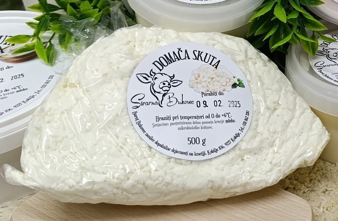 Sočna zrnasta skuta narejena iz kislega mleka in sušena z dogrevanjem. Pakiranje 500g in 1000g v vrečkah.